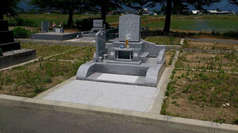 ○白御影石 洋型 全て白御影石でお納めいたしました。2坪と長井市霊園では広いほうの区画になりますのでお参りの際にゆったりできるようにと手前部分を石張仕上げにさせて頂きました。 山形県長井市に施工させて頂きました。