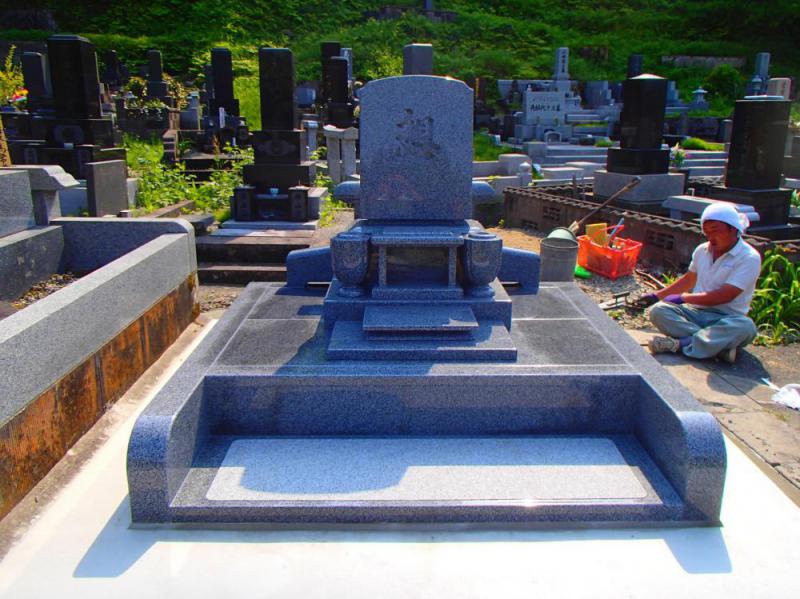 ○カノン型+風美型お手入れのしやすさとシンプルな形にこだわったお墓です。正面には『想』の文字一字。お手入れのしやすさを求め、今まで砂利敷きが多かった部分を石張り仕上げにされる方は近年多くなっております。 山形県小国町に施工させて頂きました。