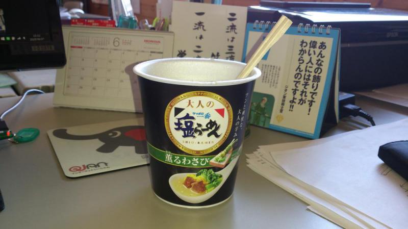 本日は休日当番でしたが午前中尾花沢市まで。亡き奥様の出身地の石をお石塔、外柵すべてに用いての建立ご契約を頂戴してきました。 弊社から片道2時間ほど掛かりますので社に戻って13時。お昼を途中で済まそうかと思ったのですが少しでも早く戻ろうと途中のコンビニで食糧調達。 大人の塩らーめん。 薫るわさび。 消費者心理なのか残り1個になっていたことと『わさび』が程よく暑い今日の気温にピッタリじゃないかと都合の良いように理由をつけおにぎりと一緒に購入しました。 薫るわさび・・・すする食品で熱いものであるカップラーメン、わさびは危険です! おいしいんですが刺さります、喉に(ToT)/~~~ 眠気も吹っ飛びもう少し頑張ります!