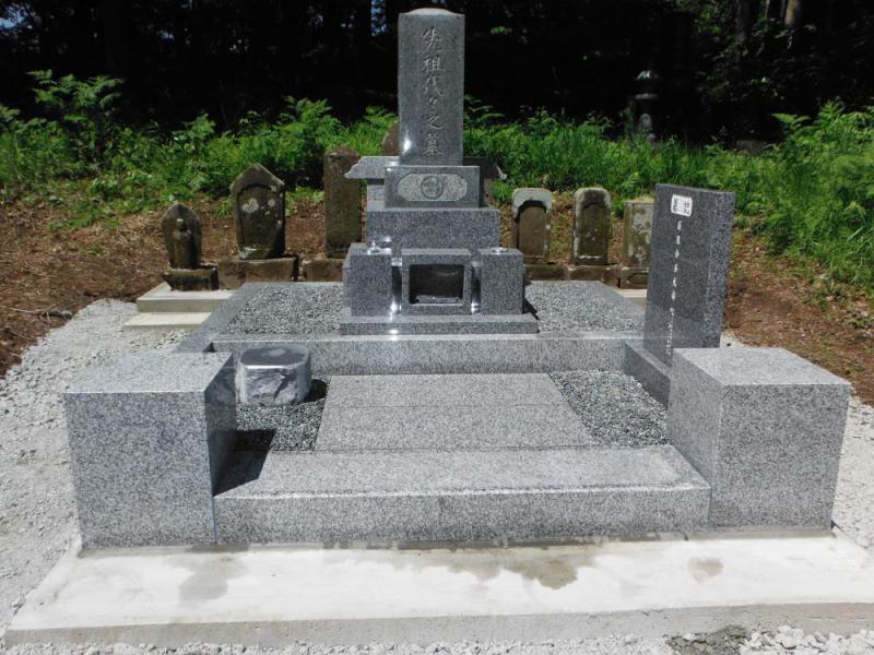 ○シンプル外柵リフォーム 既存のお石塔から竿石(一番上)と上台(その下)の2つを利用し他をシンプルに新しくするリフォーム工事です。違う場所にあった古いお石塔も移設し安置致しました。 山形県朝日町に施工させて頂きました。