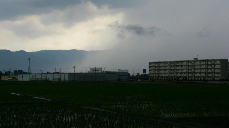 お昼休みが終わると現場の職人から電話が・・・「戻っていいですか?」南小国の現場が大雨で出来そうもないとのこと。 当社所在地も怪しいなと思い外を見てみると 雨の境がくっきりとしていました。 ものの数分で もの凄い突風が吹きました。字彫場にも雨が吹き込んできてしまい作業を一時中断です。 こいつも避難してきました。 事なきを得るといいと思いますが街なかもいろんなものが飛んでるようです。