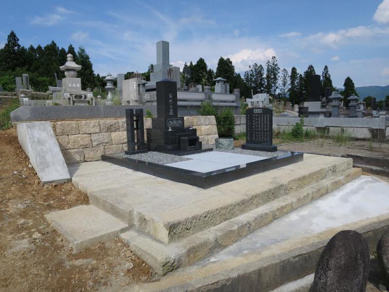 ○リフォーム工事既存のお石塔、上2段は宮城県産伊達冠石、他は山形県産高畠石で65年前に建立されていたお墓の大規模リフォームです。 伊達冠石特有の錆による経年変化が著しかったので磨き直しをお勧め。 全面磨き直しと彫刻のやり直し。 墓所全体を高畠石で覆い、後ろの法面は錆御影の間知石積み。 お施主様が高畠石の古材をお持ちでそのまま使いたいとのご希望で古さを表した墓所になりました。なかなかいい雰囲気が出たと思います。お施主様からも大変お喜び頂きました。 山形県白鷹町に施工させて頂きました。