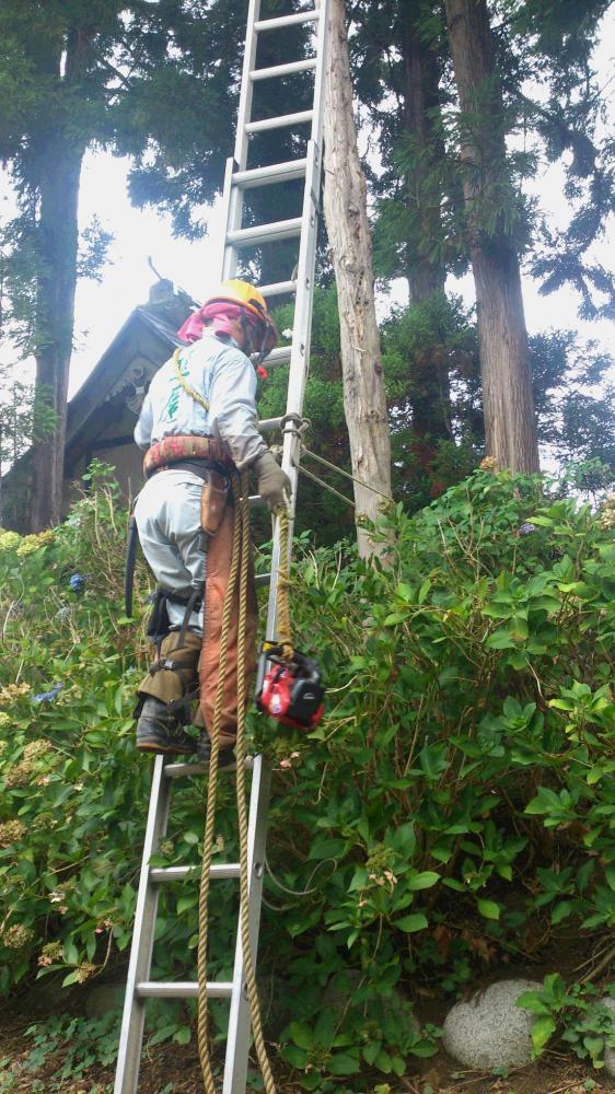 お盆休みが明け、我々業界的には一段落した感があるのですがお蔭様でご寺院様からのご用命が多かったり、いよいよ建立といった物件があったりとなかなか落ち着いてPCの前に座れなくています。 昨日は寺院境内と隣接する神社境内の支障木伐採。うちの職人もここ数年多くの木を伐採しましたが今回は本職を頼みうちの2人は補助員的に作業にあたりました。 松1本と杉3本、伸びた枝の選定。木こりやさんにとってはどうってことない作業でしょうけどやはり私たち素人木こりとは全く違います。 作業が順調に進むので伐採する木も増えていきました(^_^;) 背中に樵屋(きこりや)と背負った職人、金田氏にお手伝い頂きました。