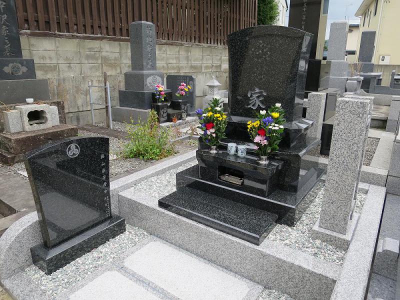 ○雲上型 約1坪の墓地に建立です。近隣には和型のお石塔が多く建てられておりますがモダンなデザイナーズ墓石をお選びいただきました。 山形県長井市に建立です。