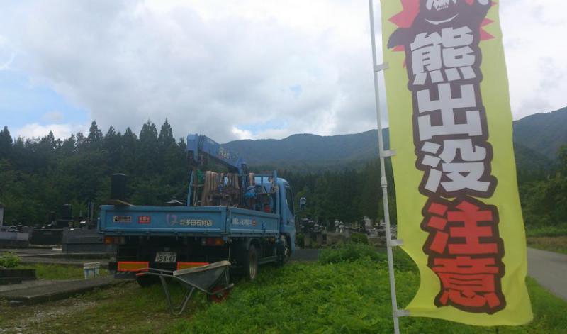 久々の一日晴れの予報。この日を逃すまいと午前中は現在進行中の現場を廻ってきました。朝日町2ヶ所と白鷹町1か所、長井市1か所の計4か所を確認、点検。 白鷹の現場で でました、熊出没注意の幟。 以前は現場でのラジオは控えるように言っていましたが緊急地震速報や『熊』対策のためラジオを許可しています。 でもこの幟… 恐怖をあおります。 朝日町ではどちらも山間の墓地でしたのでちょっとした物音に必要以上に反応してしまいます。 今日は長井市内のあちこちで例大祭の大きな旗や提燈を見かけます。当社のある長井市の泉地区でも夕方近くに黒獅子が会社に見えられます。 今日は晴れでも明日は雨の予報。各神社の獅子連中の方々は大変だと思いますが地域の安穏のため、頑張って頂きたいと思います。 さてこれからお獅子をお迎えする準備です。