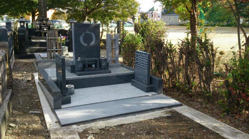 四角を基調としたデザイナーズ墓石、Square型。 青御影石と白御影石を組み合わせて施工させて頂きました。 正面には『円相』を刻んだのみのお石塔です。なかなかいい感じの仕上がりになりました。 山形県長井市に施工させて頂きました。
