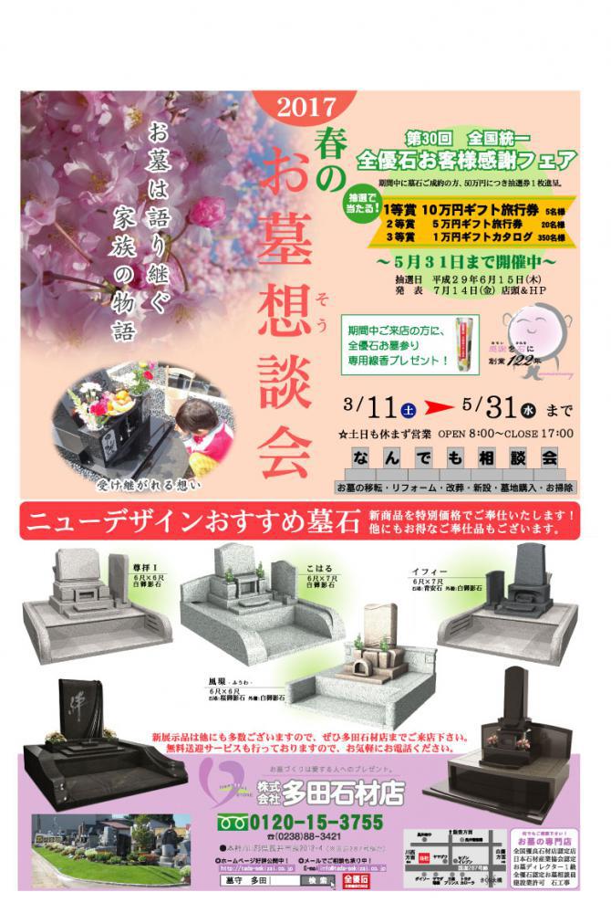 2017春のお墓想談会、3月11日(土)より開催致します。今回もご奉仕価格のお墓セットをはじめ来店記念品のプレゼント、ご成約の方に第30回全国統一 全優石お客様感謝フェア抽選券の進呈など特典満載です。ニューデザインのお墓も取り揃えましたのでじっくりとご覧頂ければと思います。お気軽にご来店ください。