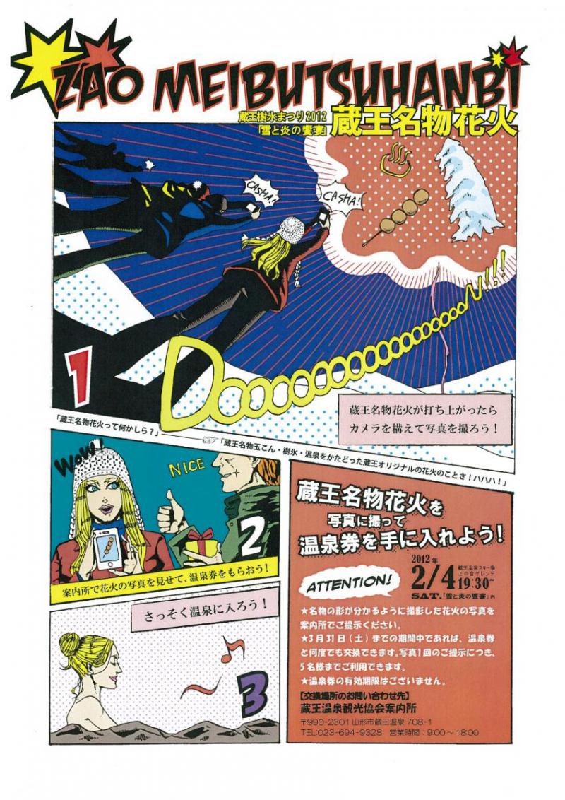 この花火を形が分かるように撮影し、翌日5日から3月末まで観光協会案内所で写真を提示すると共同浴場の無料入浴券がもらえます!