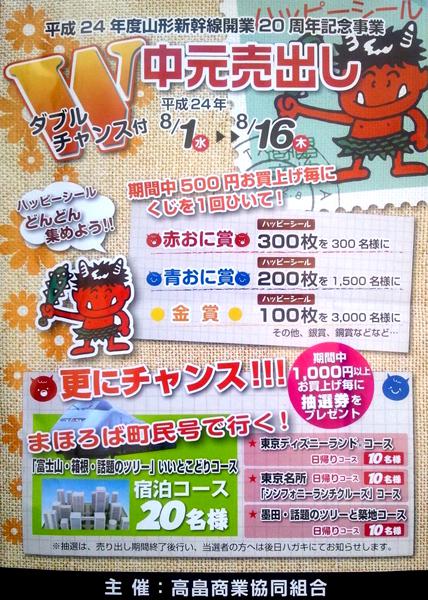 恒例のくじ引き中元セールですが、今回はwチャンスとして1000円お買い上げごとに「まほろば町民号」で行く旅行が当たるチャンス!