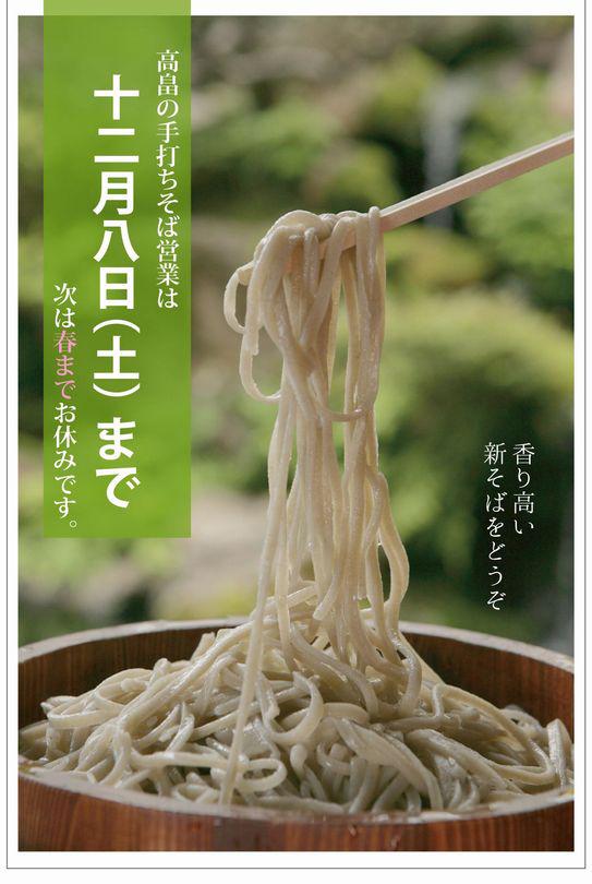 例年通り、伊澤商店は冬期間は山形市の蔵王温泉スキー場での営業になるため、高畠店の蕎麦営業は休止となります。