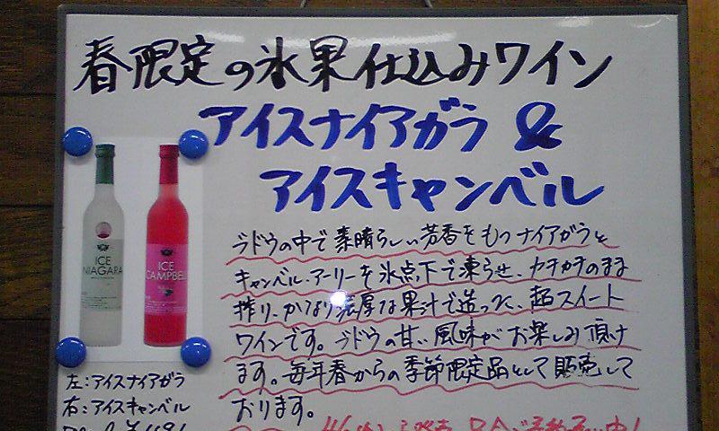 凍ったナイアガラで造った『アイスナイアガラ』、凍ったキャンベル・アーリーで造った『アイスキャンベル』。どちらもぶどうの風味があり、濃い甘味が楽しめるワインです。特に甘口好きの方にオススメ。春からの限定ワインだっし(^_^)ご予約の方は明日発送します。