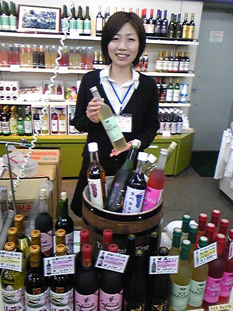 画像は今日販売担当のおらいの女子社員(地元飯豊町出身)。オススメは春限定のかなり甘ごい氷果仕込みのワイン『アイスナイアガラ』。