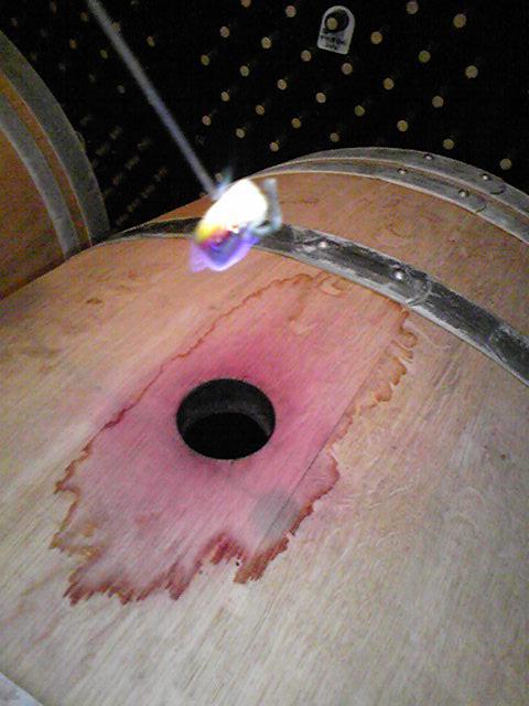 トローチ状の硫黄さ火つけで、しばらく樽の中さ吊るして約20分ほど中を殺菌します。そしてまた新しいワインを樽の中さ入れで、熟成させます。