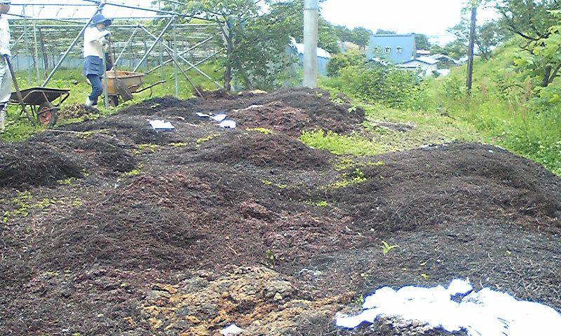 毎年この時期になると搾りカスが乾燥しているので、それをスコップで一輪車に積んで、場所を借りている阿部さんのブドウ畑に蒔きます。昨年はワイン用、ジュース用合わせて約80トン分のブドウの搾りカス。6人かがりだげんと、かなりの重労働です。今日は涼しがったげんと、雨降ったりして大変でした(*_*;
