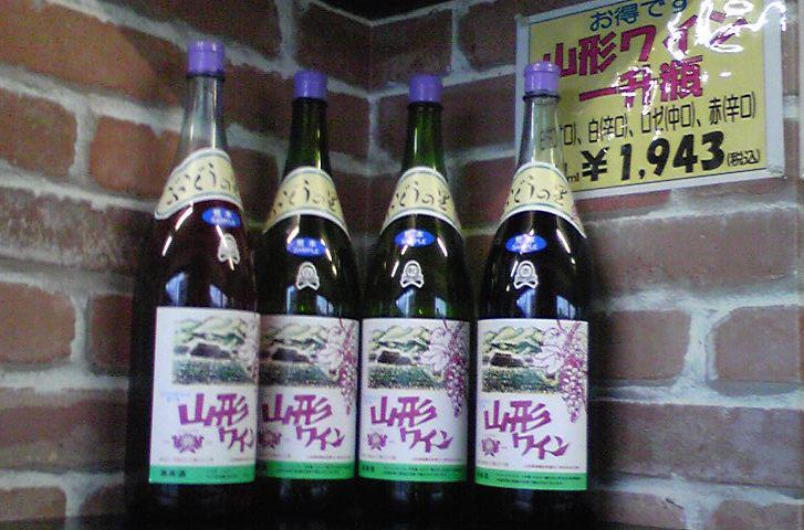 おらいの看板商品『山形ワイン』の白・甘口、白・辛口、ロゼ、赤は720mlと同じ品質のものを一升瓶にも詰めてます。んだがら、量は2倍半入って、値段は倍しないので、かなりお徳だっし。