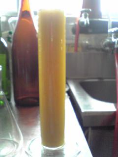 本日は昨日絞った果汁を2℃の業務用冷蔵庫の中で一晩おいた、果汁の上澄みを発酵タンクに移動して、オリをろ過をし、ワイン専用酵母を添加しました。果汁にペクチナーゼという酵素を入れると画像をみて頂ければわかりますが、ぶどうのペクチンが分解されて、清澄化されます。基本的にはきれいになった上澄みだけを使って発酵させます。