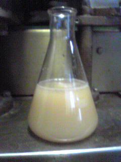 デラウェア発酵5日目の画像です。発酵中のワインをワイングラスで飲むとスパークリングワインのようで優雅な気分になれます。昨日よりも甘い香りが出てきました。発酵温度を下げたので酵母が少し元気がなくなったようです。明日の朝には12℃から5℃まで発酵温度を下げます。