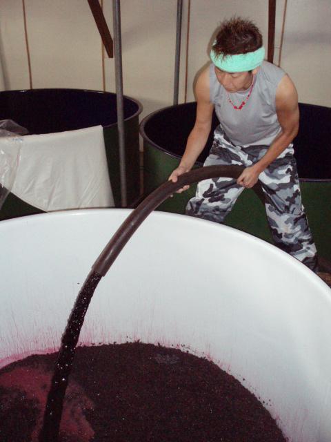ナニをしった画像だがって言うと、ポンピングシャワーという作業をしったどごだっし。先日仕込んだベリー・アリカントAというぶどうの醪の正面に、呑み口から発酵液をポンプで汲み上げて、ジャーってかけてます。そうすっと、液に色やタンニンやポリフェノールなどが溶け込んでいきます。赤ワイン仕込みは、だいたい1週間ほどこの作業を毎日行います。早い話し、櫂入れの作業と同じことです。