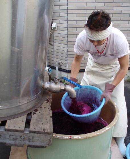 今日も朝から慌しく、醪の櫂入れや、『赤湯ヌーヴォー(白)』の瓶詰めや、赤ワイン用のタンクの2本の引き抜き(醪から発酵液だけを抜く作業)をしたりしてました。画像は、少量の仕込みだげんと、舟形町の山葡萄ワインの引き抜き作業です。同町の山葡萄でワインを造るのは今年で2回目です。昨年より糖度が有り、酸味も穏やかな感じです。山葡萄独特の、紫がかった若々しい色がなんともきれい。