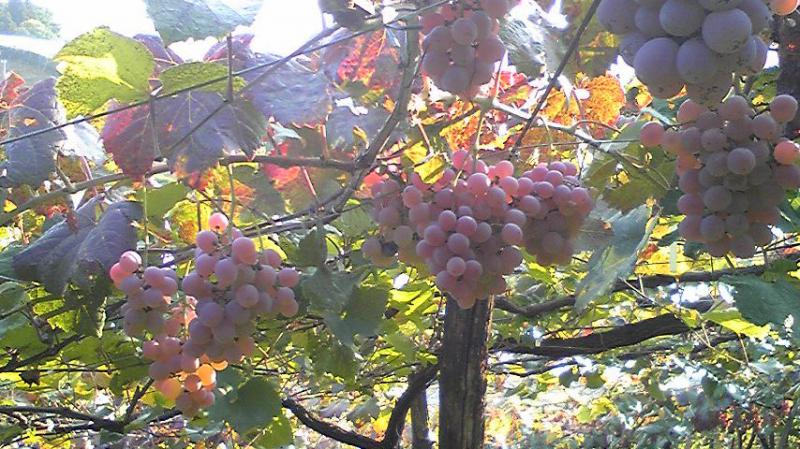 画像は、今現在の甲州種だっし。かなり険しい道を通って、赤湯の甲州を栽培している生産者の方に見せて頂きました。デラよりは少し薄い淡い紫色で、香りと味は大人しいぶどうです。おらいでは、この甲州を辛口に仕込み、『バレルエージング(ブラン)』や『SL<シュール・リー>などに造ります。
