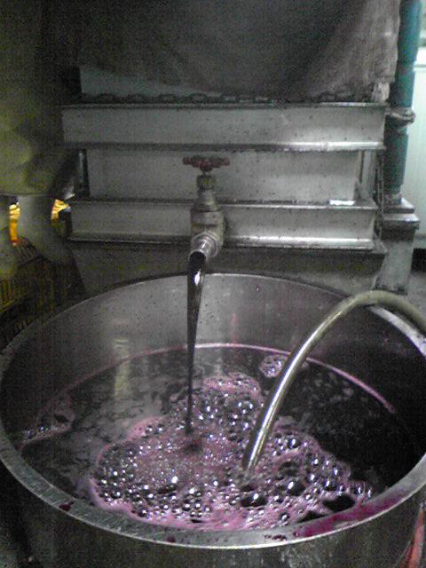 昨日カベルネを破砕してから煮て、今日搾って詰めました。2008年産のカベルネは例年以上の糖度なので甘味があり、欧州系赤ワイン用のぶどう特有の渋味があって今年のもおいしく出来そうです。