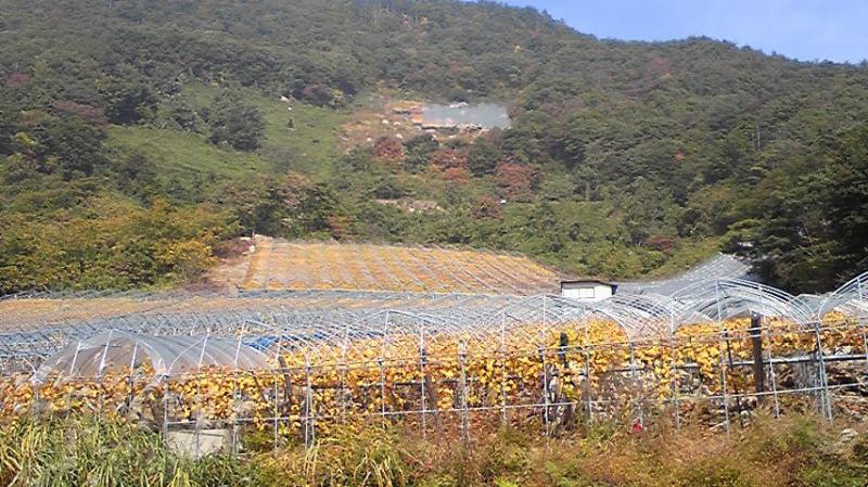 画像は貯蔵庫前の風景。松沢の山も少し紅葉が始まり、ぶどう畑の葉も黄色くなって、秋の深まりを感じる風景になってきました。ぶどうは落葉樹なので、葉が落ちてくると、いよいよ冬が近づいてくるのを感じます。やんだなぁ(T_T)