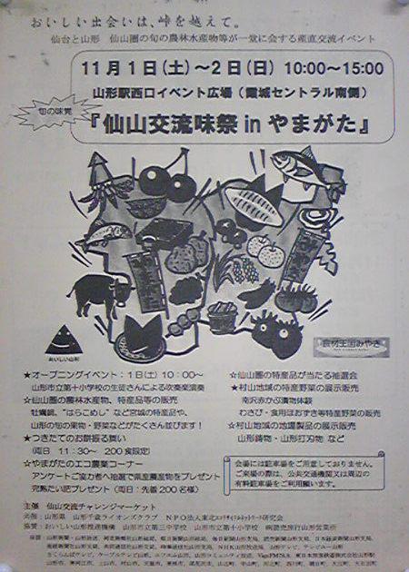 今週末の11月1日(土)と2日(日)、『仙山交流味祭inやまがた』さ出展するっし。場所は山形駅西口イベント広場にて、両日とも10時〜15時まで。