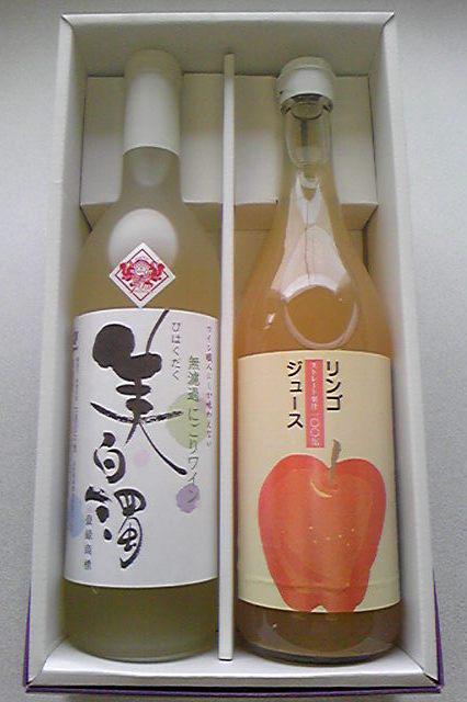 この時期ギフト類はあまり出ませんが、画像のギフトは冬限定の『リンゴジュース』とにごりワイン『美白濁』の詰め合わせです。どちらも冬場だけ発売の商品です。この時期オススメだっし。ちなみに、リンゴジュースはおらいのショップでしか売ってません。