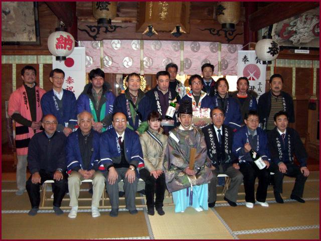 宮司さんの後方で瓶を持ってポーズしているのが小生です。