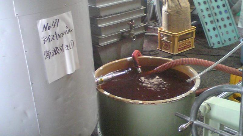 昨年の12月に氷果キャンベルで仕込んだワインを、タンクから出して粗濾過(軽く濁りをとる濾過)をしました。氷果仕込み特有の濃い甘味があり、キャンベル・アーリーのぶどう香がきれいに出た感じです。