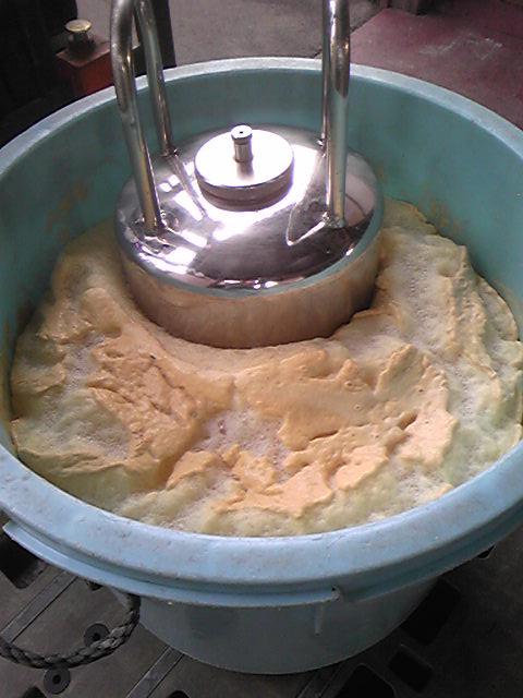 山形県産のふじリンゴの果汁を発酵させて造ります。画像は、その発酵させる元である酒母(しゅぼ)。これを果汁の入ったタンクに添加して暫くすっと、発酵が始まります。銀色の筒状のものは暖器という物で、中にお湯を入れて醪を温める時使います。まだ寒い時期なので、暖器を酒母に入れて、酒母をギリッと勢いづかせます。