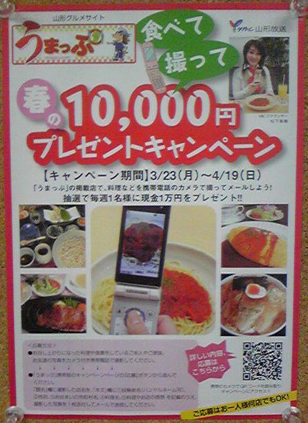 おらいでも加盟しった山形グルメサイト『うまっぷ』。この『うまっぷ』の掲載店で、お召し上がりになった料理や、食事をしているご本人、ご家族、お友達の写真をカメラ付き携帯電話で撮影し、『うまっぷ』の携帯版のキャンペーンページから応募すると、抽選で毎週1名様に現金1万円プレゼント。応募期間は、3月23日(月)〜4月19日(日)。