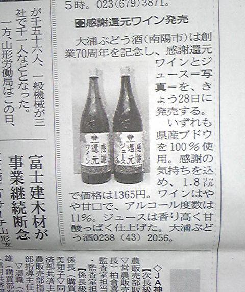 3月28日(土)の山形新聞朝刊の情報センサーに、おたいの『感謝還元ワイン』と『感謝還元ジュース』が掲載されてます。本日より、おらいのワインショップで販売してます。各種1,800ml入で¥1,365。70周年の感謝の気持ちをこめて、お安く提供してます。