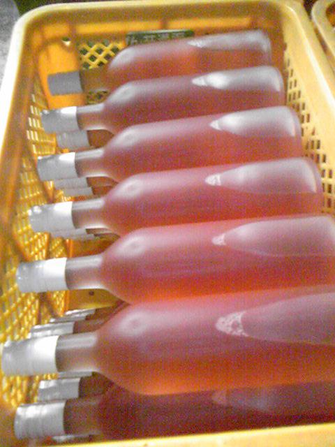 今日は、桜まつりなどで販売するこの時期オススメの『ブラッシュベリー』を瓶詰めしました。マスカット・ベリーA100%で造った、ブラッシュワイン(ロゼより薄いワイン)です。今日詰めた分も、きれいな桜色に仕上がりました。花見で飲むと、更においしいワインだと思います。