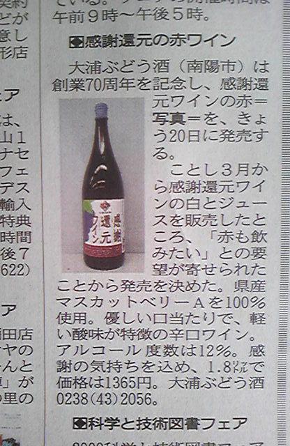 山形新聞情報センサーにおらいの『感謝還元ワイン(赤)』が掲載されてます。本日より発売です!(^^)! 70周年の感謝の気持ちを込めて、還元ということでお安く出した赤ワインです。現在、おらいのワインショップと、飯豊町めざみの里観光物産館にて販売してます。是非あがっとごえっし。