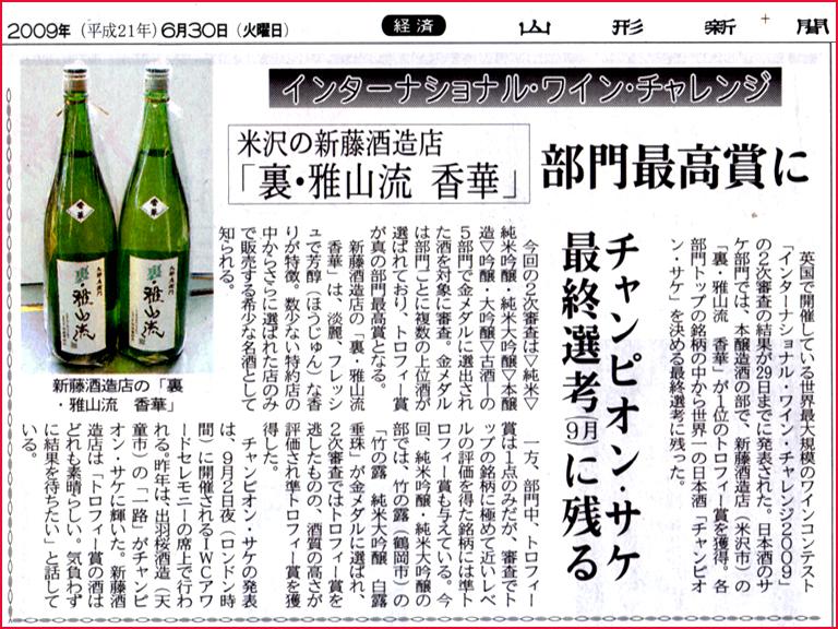 世界最大規模のワインコンテスト「インターナショナル・ワイン・チャレンジ2009」の日本酒部門・本醸造の部で‘裏・雅山流 香華’が1位のトロフィー賞を獲得した。