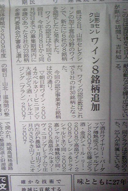 今日の山形新聞朝刊に、山形セレクションの平成21年度第1回認定ワインが公表されてます。この度県産ワイン8銘柄が山形セレクションの認定を受けました。