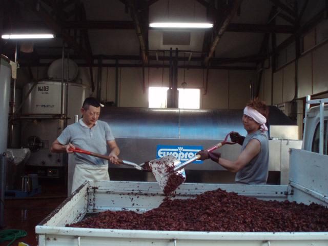 デラウェアーのワイン仕込み、今日で3日連続です。今日は、おらいのレギュラーワイン用の甘口タイプの仕込みで、昨日と同じくらい5,500キロ程搾りました。プレス機もフル稼働で頑張ってます。