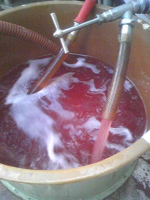 間もなく瓶詰めして出荷予定の、今年の新酒『赤湯ヌーヴォー(ロゼ)2009』の粗濾過作業を今日行いました。今年のもとってもチャーミングな色合いで、味わいは例年以上にスッキリタイプに仕上がりました。やや甘口タイプです。