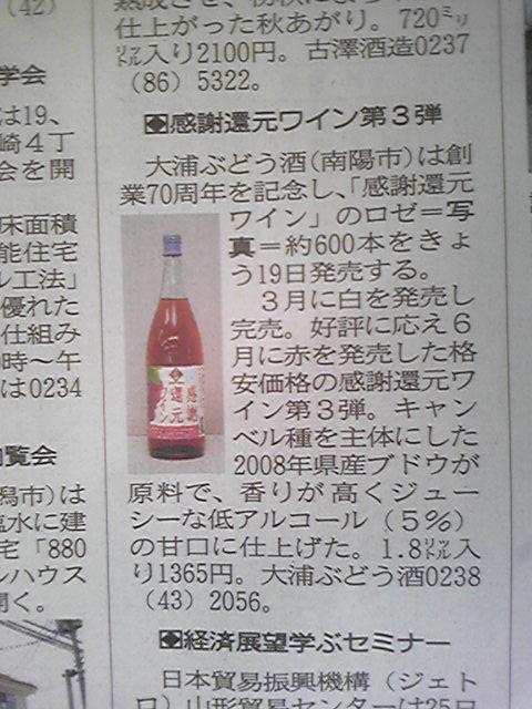 本日より発売開始した『感謝還元ワイン(ロゼ)』。山形新聞朝刊で紹介して頂きました。
