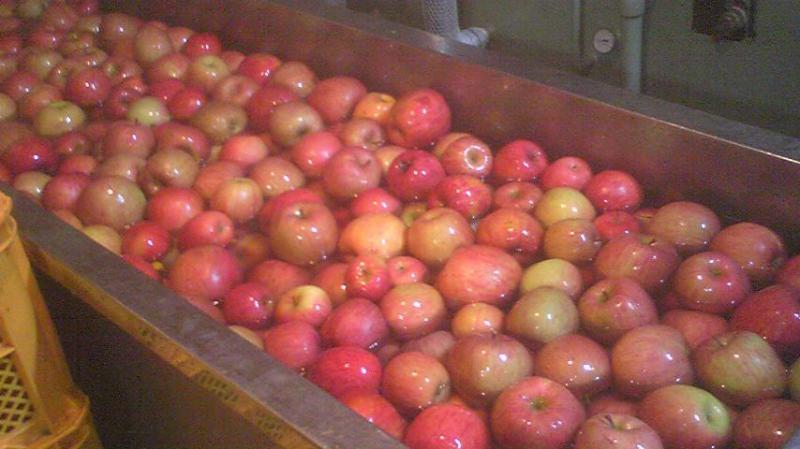 おらいでは、ぶどうのワインやジュース造りの他に、リンゴジュースも造ってます。明日は今季一回目のリンゴジュース仕込み。画像はおっきな水槽の中さ、リンゴば入れて洗浄・選果作業をするところだっし。ちなみに、地元産のふじリンゴです。