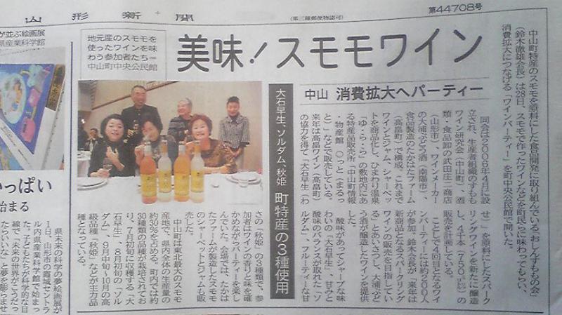 今日の山形新聞朝刊さ、先日(11月28日)行なった中山町での『すもものワインパーティー』がカラーでけっこうおっきく掲載されてます。盛大に終わって良かったです。