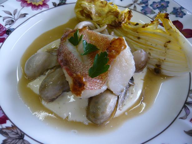 そんなわけで写真は、ふっくらと焼き上げた金目ダイ。カキ貝はごま油で軽くソテーしその汁をソースに。