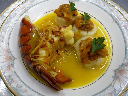 写真は「オマール海老と帆立貝とウニのワイン蒸し。サフランソース」