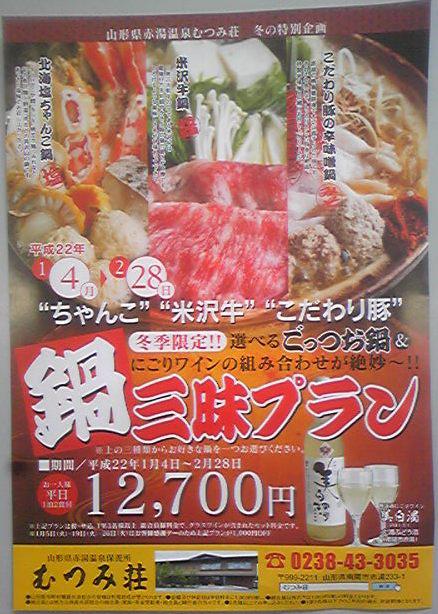 赤湯温泉保養所むつみ荘の来年1月4日から2月28日までの冬期間、鍋三昧プランがあります。塩ちゃんこ、米沢牛鍋、豚辛味噌鍋の3種類から選べて、おらいの冬だけ限定の無濾過にごりワインの『美白濁』がつきます。新年会などに是非どうぞっし。