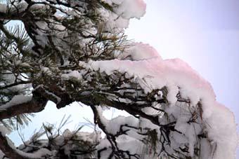 庭の松ノ木にも、雪がこんもり積もっている。(日の出時刻 06:56の12分後頃。ちなみに今日から1/8までが一年で一番夜明けが遅くなる時期だ。)