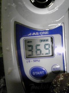 本日、先月収穫したデラウェア種を絞った果汁を凍らせ、余計な水分を取り除いた果汁に酵母を添加します。果汁糖度がなんと驚異の36.9度でした。製造をはじめてからこんなに高い果汁でワインを造った事がないのでどんなワインになるかとても楽しみです。タンクに果汁を入れてタンクごと冷凍庫にいれます。−15度で10日ほどおいてから自然解凍させると水分は凍ったままですが糖類はとけてでてきます。