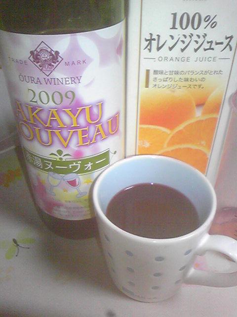 赤ワイン100mlにオレンジジュース(出来れば100%ジュース)50mlを混ぜて、マグカップに入れ、軽〜く電子レンジであっためっと、簡単にホットワインが出来ます。
