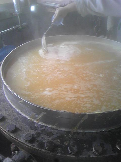 画像は搾ったリンゴの果汁を釜であっためているところ。軽〜く煮沸させ、灰汁を取って、あっついまんま瓶詰めして王冠で打栓します。そして、ラベルを貼って出来上がり。