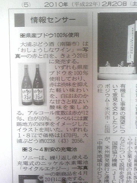今日の山形新聞朝刊の情報センサーに、新発売の大変お徳用の一升瓶『おしょうしなワイン(赤、白)』が紹介されてます。